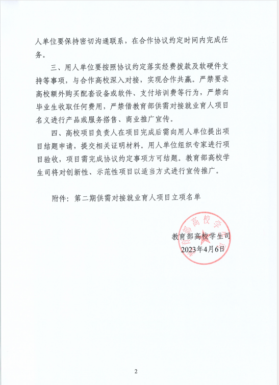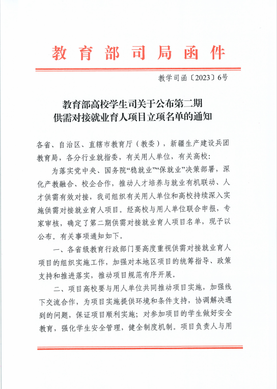 本网讯(通讯员 廖翔 )近日,教育部发布了高校员工司关于公布第二期供需对接就业育人项目立项名单的通知(教学司函〔2023〕6号),公司成功获批立项7项,其中定向人才培养培训项目1项,就业实习基地项目6项。