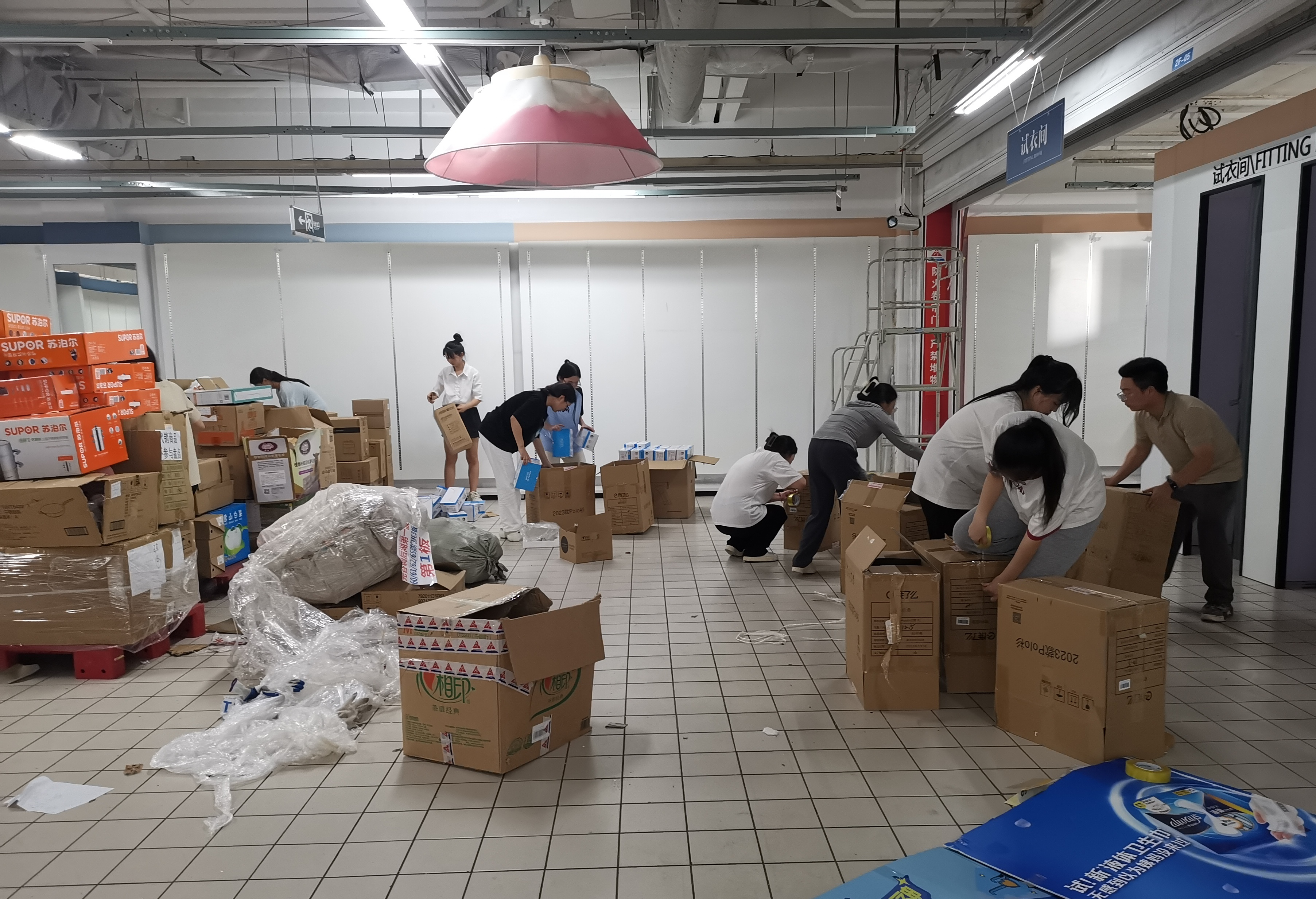 现场条件非常的艰苦。由于当天气温非常高,劳动空间较为封闭且堆满了杂乱的货物,气味较大,室内又没有空调,导致劳动环境极为恶劣。在此情况下,无论男同学还是女同学,没有一人抱怨和拖后腿,大家迅速展开劳动,以小组形式相互配进行工作,高效率的完成了所分配的所有劳动任务。从上午10点到下午4点,除了中午吃饭时休息了一会,所有同学基本都处于忙碌的劳动状态。大家不怕苦、不怕累、不怕脏,积极发扬乐观主义精神和团结协作精神,挥汗如雨,挥洒青春,留下了一串串劳动的笑声和脚步。