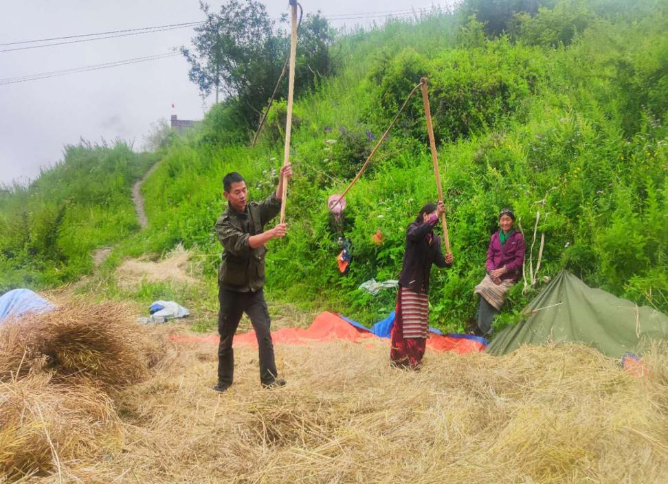 2020年3月,村里开展高山牛、牦牛养殖项目,他与党员群众徒步2小时的山路,到海拔4000多米的山上同大家一起修建暖舍。搬石块、锄地、搭房子……他事事走在前面、亲力亲为,与群众一道同甘共苦,带领群众共同开启增收道路。
