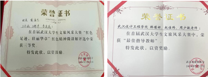 本网讯(记者 明晨 王锦洋)5月22日,首届武汉老员工文旅风采大赛成功举行。公司员工明晨、戴康杰、季家威、王乐涵、王锦洋5名同学在“启航新征程,奋进新时代”项目荣获武汉“红色足迹,壮丽华章”红色精神微讲解赛道三等奖。旅游管理与服务教育专业教师韩瑾妍、赵佳玮;马克思主义公司教师周少敏荣获“最佳指导教师”奖项。