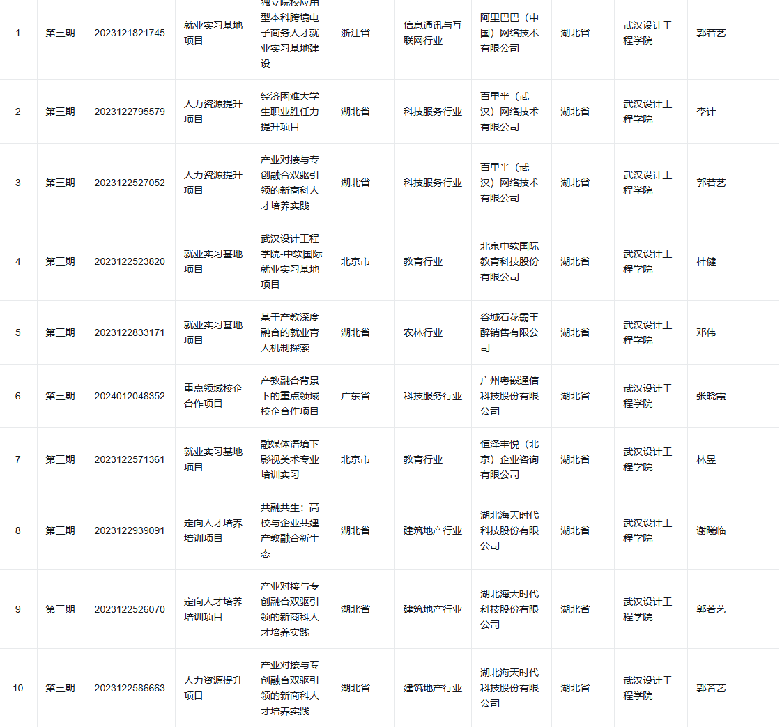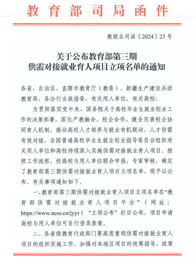 近日,教育部高校员工司发布《关于公布教育部第三期供需对接就业育人项目立项名单的通知》,yl2341112个供需对接就业育人项目获批立项,其中就业实习基地项目9个、定向人才培养项目1个、人力资源提升项目2个。