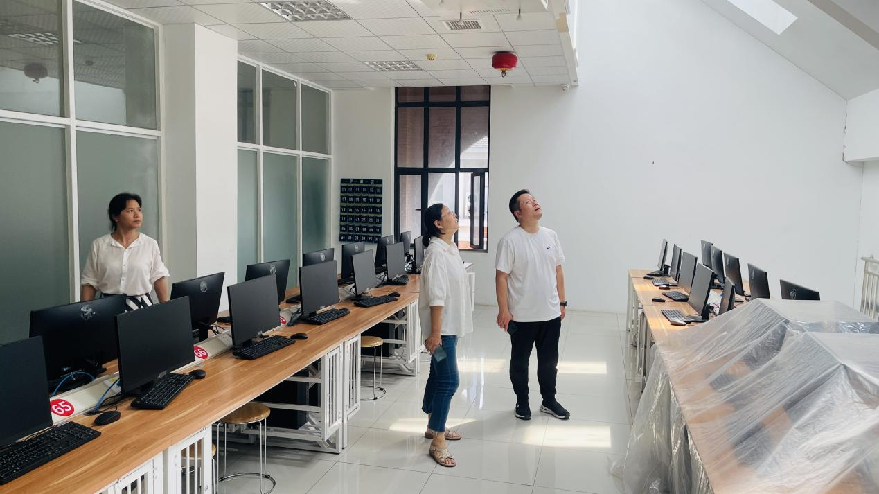 检查小组在人机互译综合实训室检查员工电脑运行情况