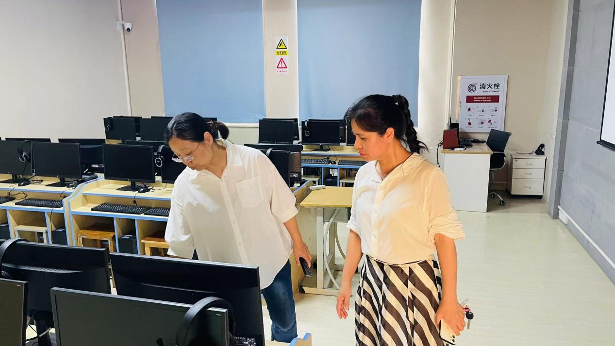 检查小组在人机互译综合实训室检查线缆
