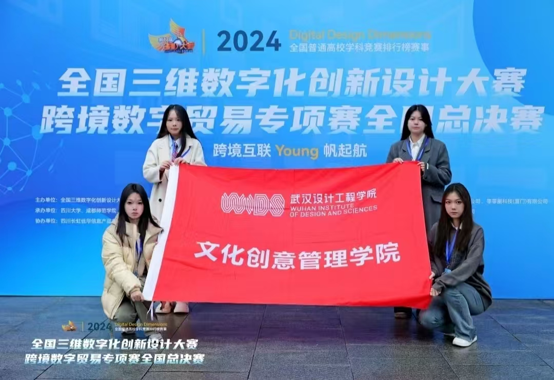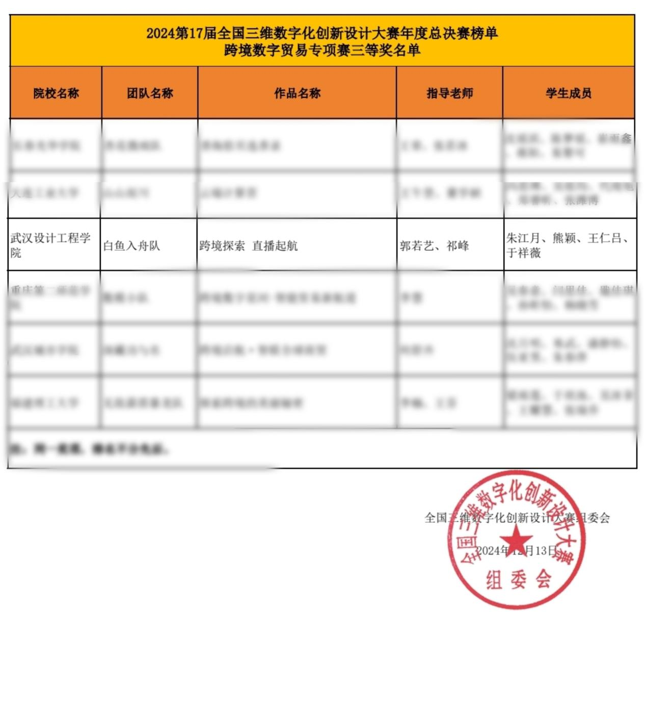 公司文化产业管理公司教师祁峰、郭若艺、宋明娟、邹晨等指导四支队伍,三支获得区域赛三等奖,其中朱江月、熊颖、王仁吕、于祥薇四名组成的yl23411白鱼入舟队晋级全国总决赛,并在决赛中脱颖而出,凭借数月的努力和精心准备,深入研究跨境数字贸易的潮流趋势,并在比赛中通过精彩的展示和答辩,赢得了评委的认可。最终荣获全国总决赛三等奖。