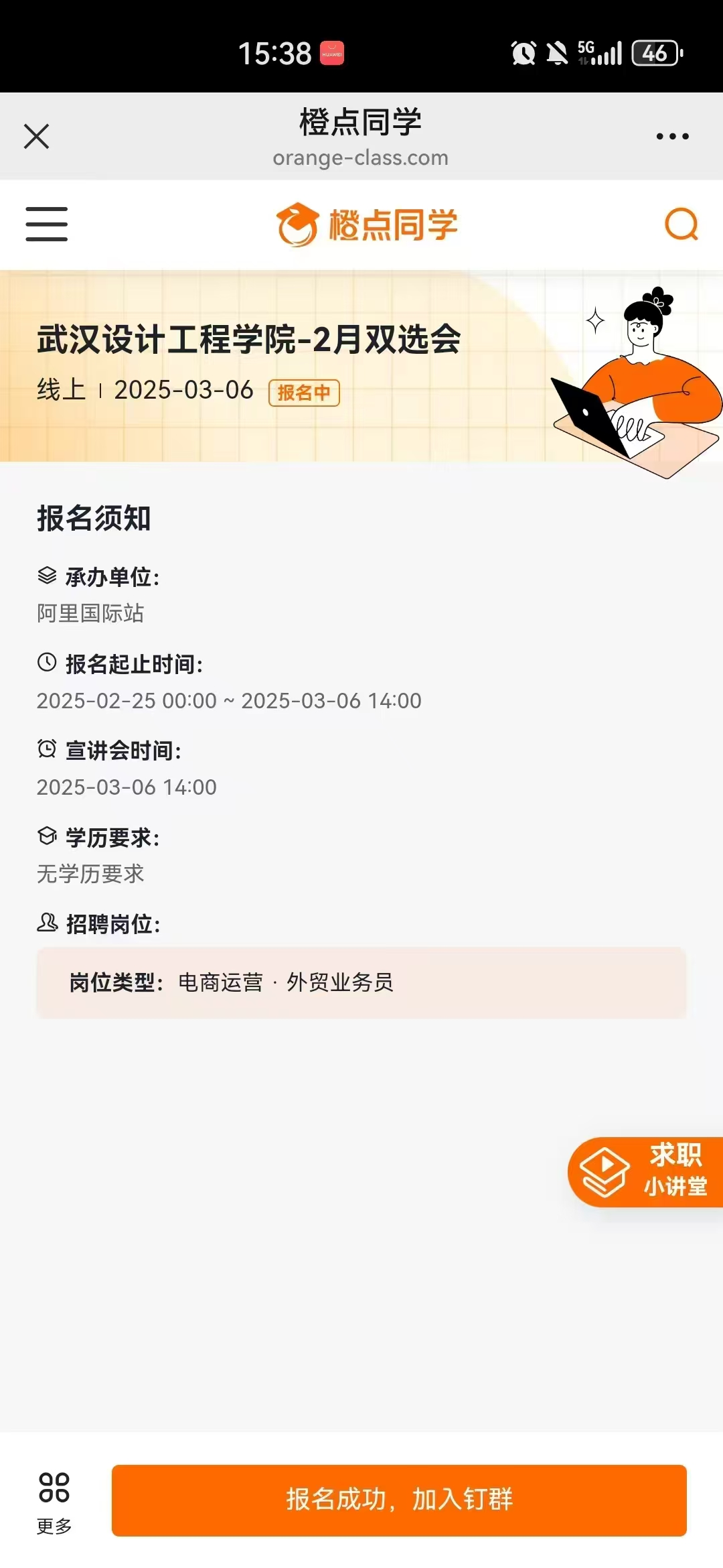 依托钉钉平台,本次双选会打破地域限制,以“直播宣讲+在线互动”形式提升效率。金松博详细解读跨境电商行业趋势及岗位发展路径,并结合企业用人需求为毕业生提供择业指导。参会企业涵盖武汉、杭州、广州等跨境电商产业聚集地,毕业生可一键投递简历,并通过实时答疑与企业深度沟通,显著缩短求职周期。