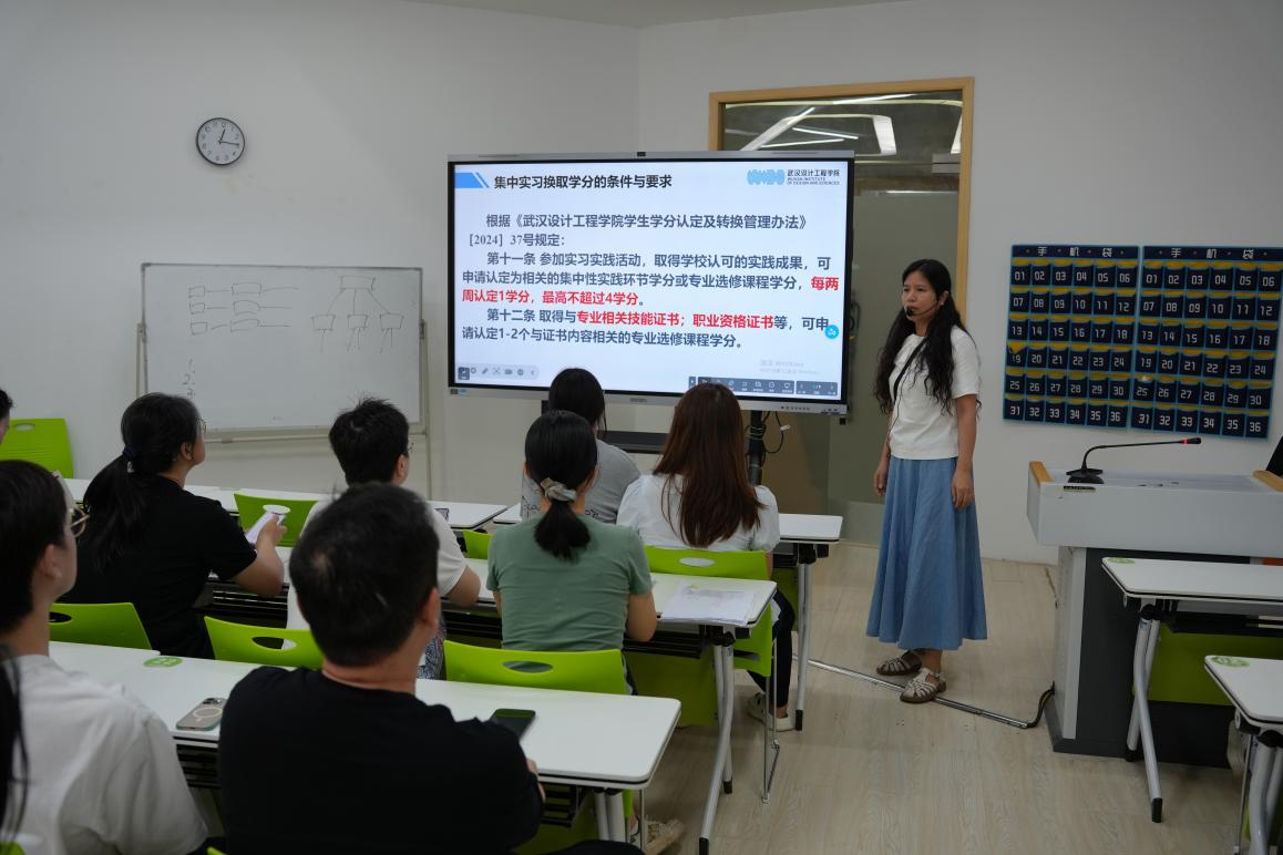 会上,潘胜莲老师系统解读集中实习全流程安排。她首先通报了实习企业的录取情况:正大食品(湖北)有限公司、武汉今天梦想商贸有限公司、谷城石花霸王醉销售有限公司等七家公司共录取50余名实习生,覆盖文化产业管理、旅游管理与服务教育、商务英语等专业。此次毕业集中实习,公司院启动“1+1+1”模式,即每位实习生配置一名校内指导老师、一名企业带教老师、一名校企对接老师,组建实习联络群,跟踪实习生到岗情况、定期汇报实习表现、解答实习疑问,确保毕业集中实习管理全程可追溯。