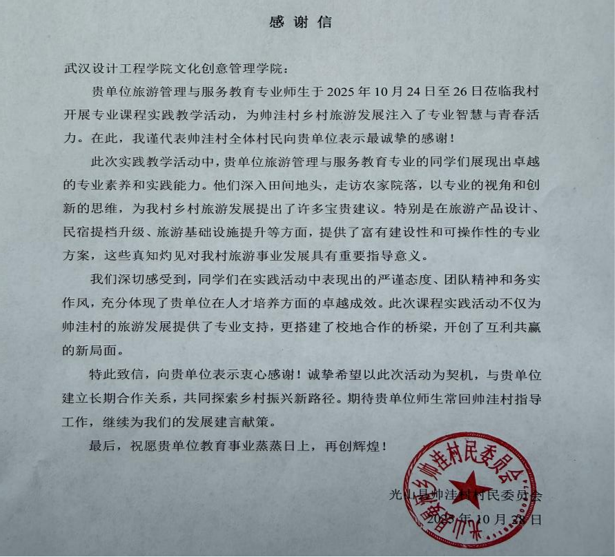 实践活动结束后,帅洼村村委会专门撰写并寄送了感谢信。信中对yl23411师生的到来表示诚挚感谢,称赞师生们带着专业知识与务实作风,通过实地调研、产品设计、民意收集等实际行动,为村庄文旅发展提供了新思路、新方案,切实助力乡村振兴,期待未来能继续深化校村合作,携手共创帅洼村旅游发展新局面。