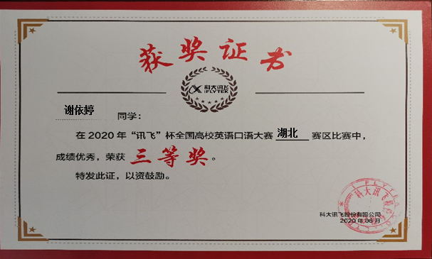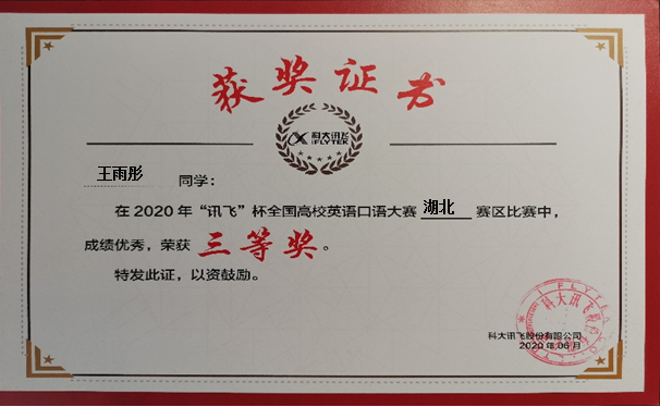 (通讯员 黄莹)2020年“讯飞杯”全国高校英语口语大赛湖北赛区比赛落下帷幕,商学 院大学英语教研室黄莹、陈伟老师分别指导的数字媒体技术1801班王雨彤、国际经济与贸易1901班谢依婷在比赛中脱颖而出,斩获湖北省赛区三等奖,系公司员工首次参加此赛事并获奖。