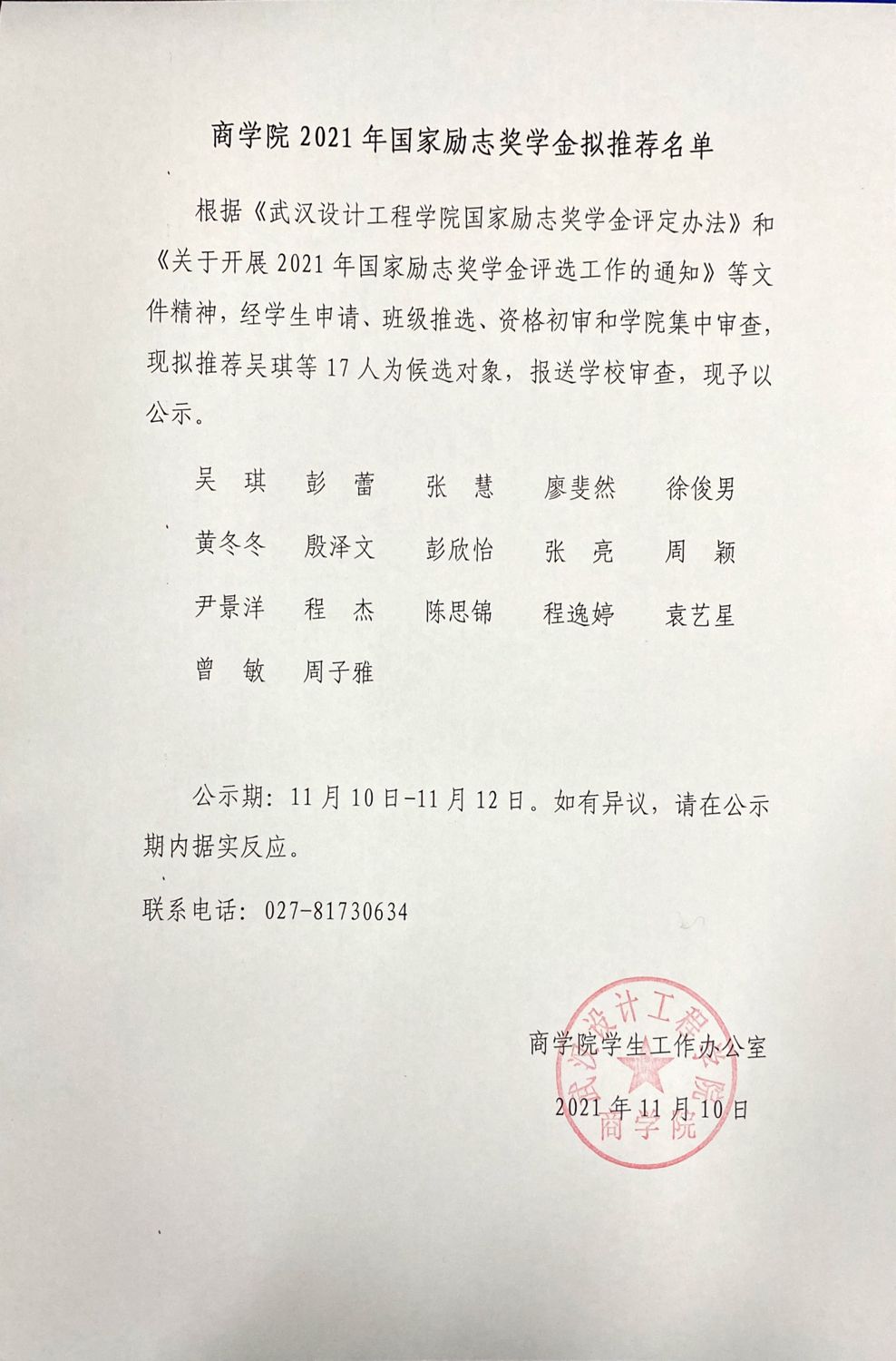 商公司2021年国家励志奖学金拟推荐名单