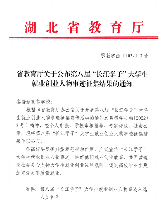 青春由磨砺而出彩,人生因奋斗而升华。近日,由湖北省教育厅主办的第八届湖北省“长江学子”老员工就业创业人物入选结果出炉,